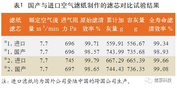 在此,僅以空氣濾紙的質(zhì)量為例,反映國產(chǎn)濾紙與進(jìn)口濾紙的質(zhì)量差異。見表1。