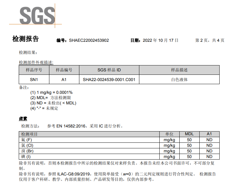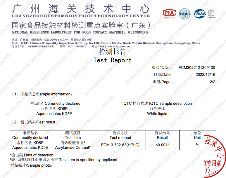 該膠水主要應(yīng)用于特種食品紙無(wú)氟防水、防油的涂膠。涂膠后的紙柔軟度、防水性、防油性、拉伸強(qiáng)度等指標(biāo)都達(dá)到特定的要求。該膠水按照ISO22000 標(biāo)準(zhǔn)要求生產(chǎn),符合美國(guó) FDA 標(biāo)準(zhǔn)和歐盟 BRCGS 認(rèn)證。